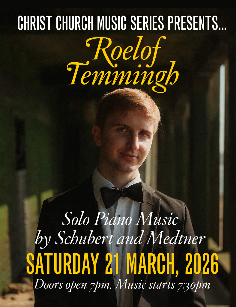 On the evening of 21 March, we have the special privilege of hearing our very own Director of Music, Roelof Temmingh, in concert. Details to follow soon. As many of you know, Roelof is a gifted professional concert pianist, and we are richly blessed by his ministry among us. His Sunday voluntaries lift our hearts heavenward, and I know many of you, like me, treasure them deeply.